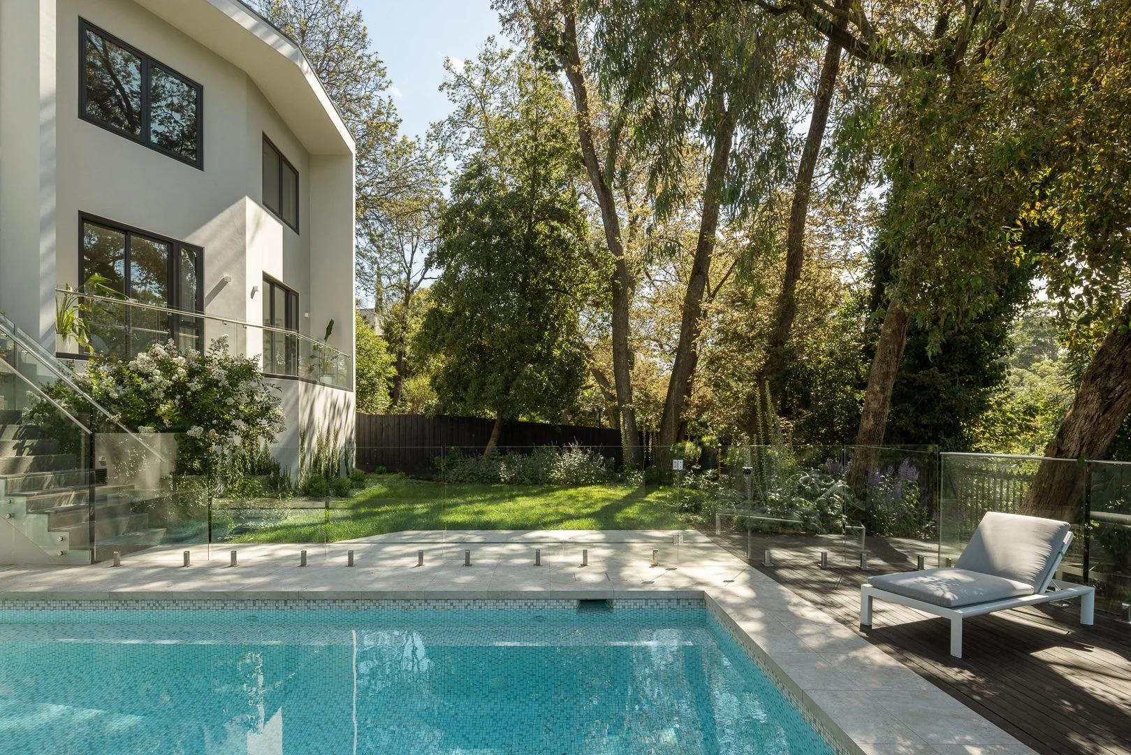 The main living spaces are open, warm and highly connected to the outdoors. A cantilevered deck extends from the living pavilion, floating above the slope and becoming one of the defining architectural features of the home. Structurally complex, this element required meticulous planning and coordination, reinforcing Easton’s experience in delivering technically demanding builds on sloping land.