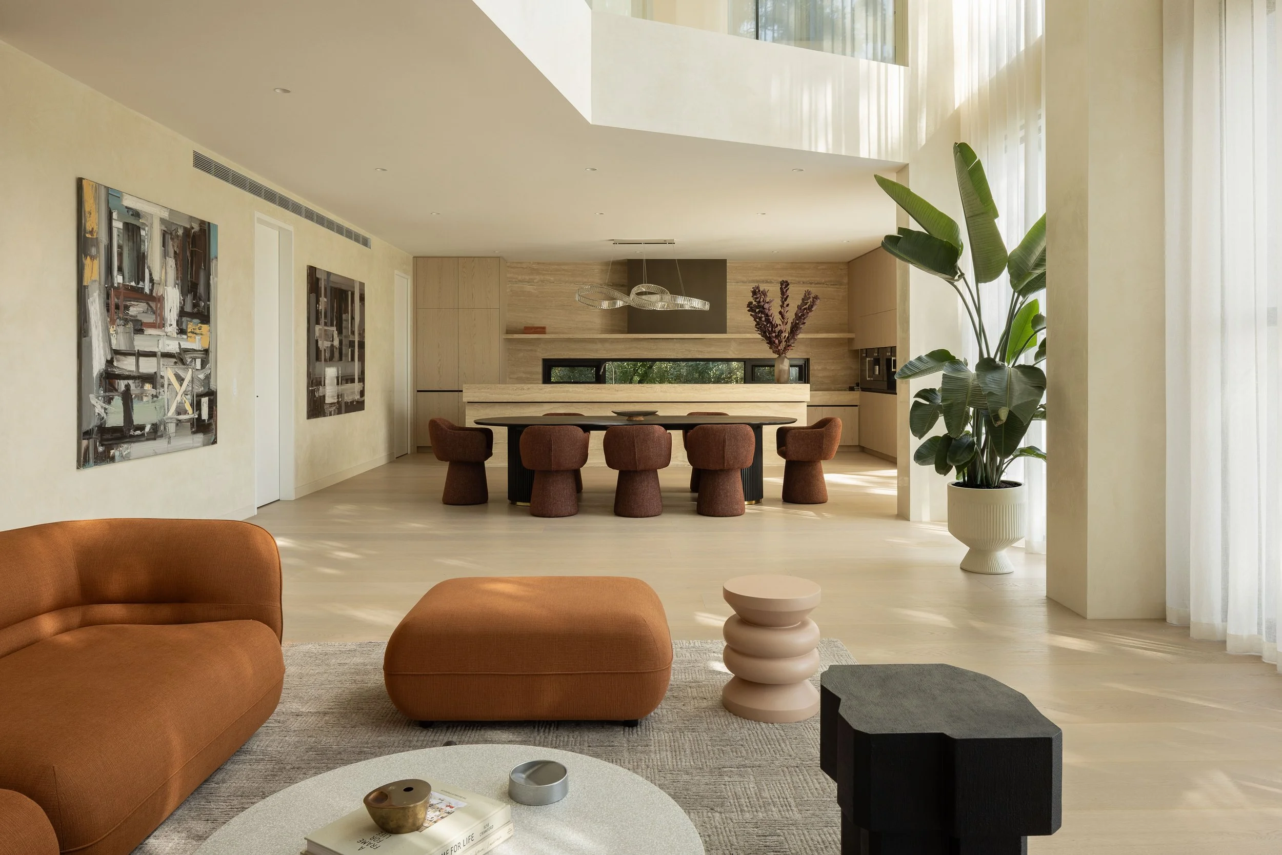 The architectural response is deeply site-driven. Instead of a single dominant form, the home steps with the natural fall of the land, breaking down scale while maximising outlook and privacy. Each pavilion is carefully positioned to capture long views and natural light, while maintaining a strong physical and visual connection to the terrain. The result is a home that feels embedded into the landscape rather than imposed upon it.